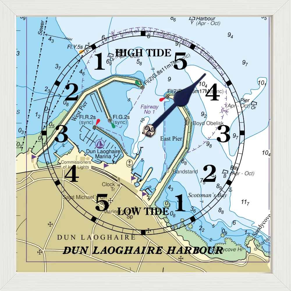 Skip to contentOur Dun Laoghaire Harbour Tide Clock, Ireland,shows a small section of the original marine chart, focusing on Dun Laoghaire harbour.Originally called Dunleary and then renamed Kingstown after the visit of King George the IV in 1821, before reverting to Dún Laoghaire once again, the south Dublin town is a residential area, a seaside town and the site of Ireland’s first railway terminus.